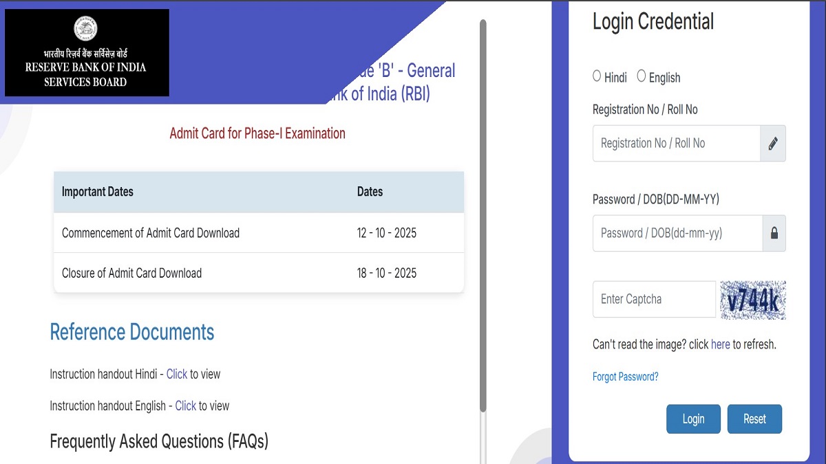 Reserve Bank of India has released RBI Grade B admit card 2025 for posts of Officers in Grade ‘B’ Direct Recruit-DR and General/DEPR/DSIM Cadres. Registered candidates can download RBI Grade B 2025 admit card online at official website opportunities.rbi.org.in. They have to use their registration number or roll number and password or date of birth. RBI Phase I exam for Officers in Grade B will be held on October 18 and 19, respectively.