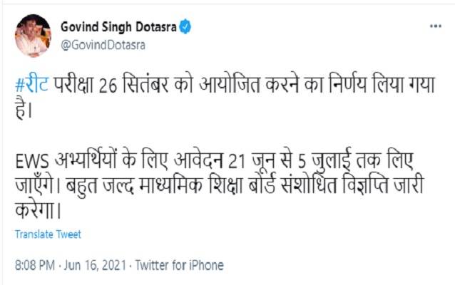 REET 2021 new date announced by Education Minister Govind Singh Dotasara, application for EWS candidates to release soon.