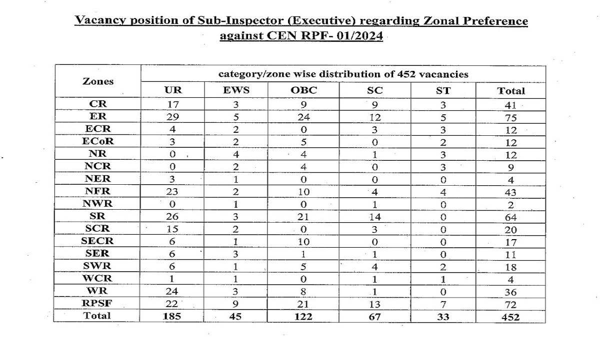RPF SI Recruitment 2025: The Railway Protection Force has announced the RPF SI zone-wise vacancy details for the post of Sub Inspector (Executive) under the recruitment notification CEN RPF-01/2024. A total of 452 RPF SI vacancies have been allocated across various railway zones, distributed under the categories of Unreserved (UR), Economically Weaker Section (EWS), Other Backward Class (OBC), Scheduled Caste (SC), and Scheduled Tribe (ST).