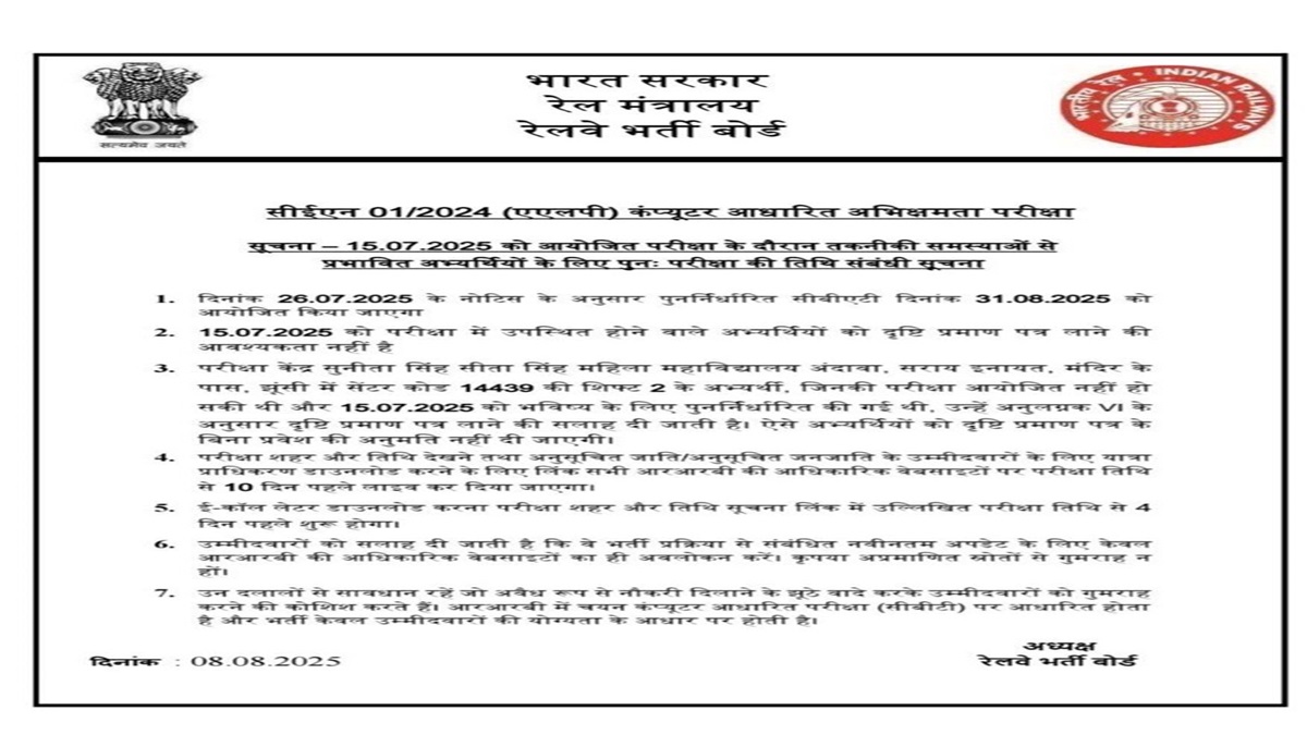 RRBs announced the RRB ALP 2024-25 CBAT revised exam dates. The re-exam will be held on August 31, 2025. RRB ALP admit card for CBAT will be released four days before the exam.