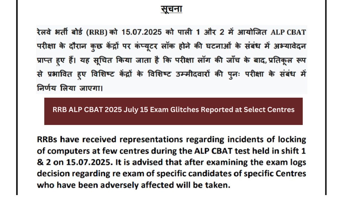 RRB ALP CBAT 2025 Exam: The Railway Recruitment Boards (RRBs) have issued a notice regarding the RRB ALP CBAT July 15 exam 2025. The notice states that RRBs have received multiple representations concerning technical glitches during the ALP CBAT exam conducted on July 15, 2025. Candidates who appeared for the exam reported incidents of computers getting locked at a few centres during both shift 1 and shift 2 of the test.