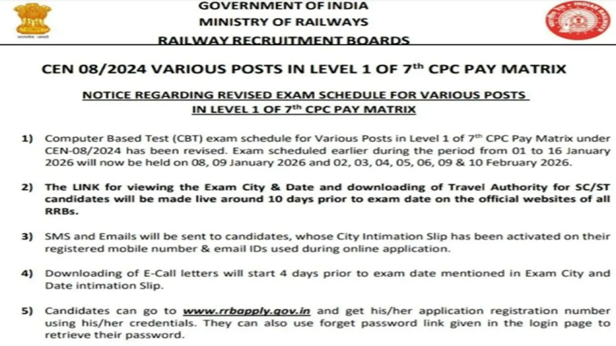 RRB Group D Recruitment 2025: Railway Recruitment Boards have rescheduled RRB Group CBT exam dates under CEN-08/2024. Earlier, exam was scheduled to be held from January 1 to 16, 2026. As per the revised schedule, RRB Group D CBT will now be conducted on January 8 and 9 2026, and February 2, 3, 4, 5, 6, 9 and 10 2026. The information regarding RRB Group D revised exam dates 2025 has been announced through official notic at official website of railways.