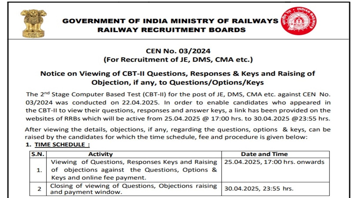 RRB JE 2025: The Railway Recruitment Board (RRB) conducted the RRB JE CBT 2 exam for the session 2024 on April 22, 2025, across the country. As per the official notification, the RRB JE CBT 2 2024 provisional answer key will be released on April 25, 2025, on the official website along with the question paper and response sheet. Candidates who appeared for the CBT 2 will be able to view their questions, responses, and answer keys by visiting the official websites of RRB. The link will be active from April 25, 2025, to April 30, 2025.