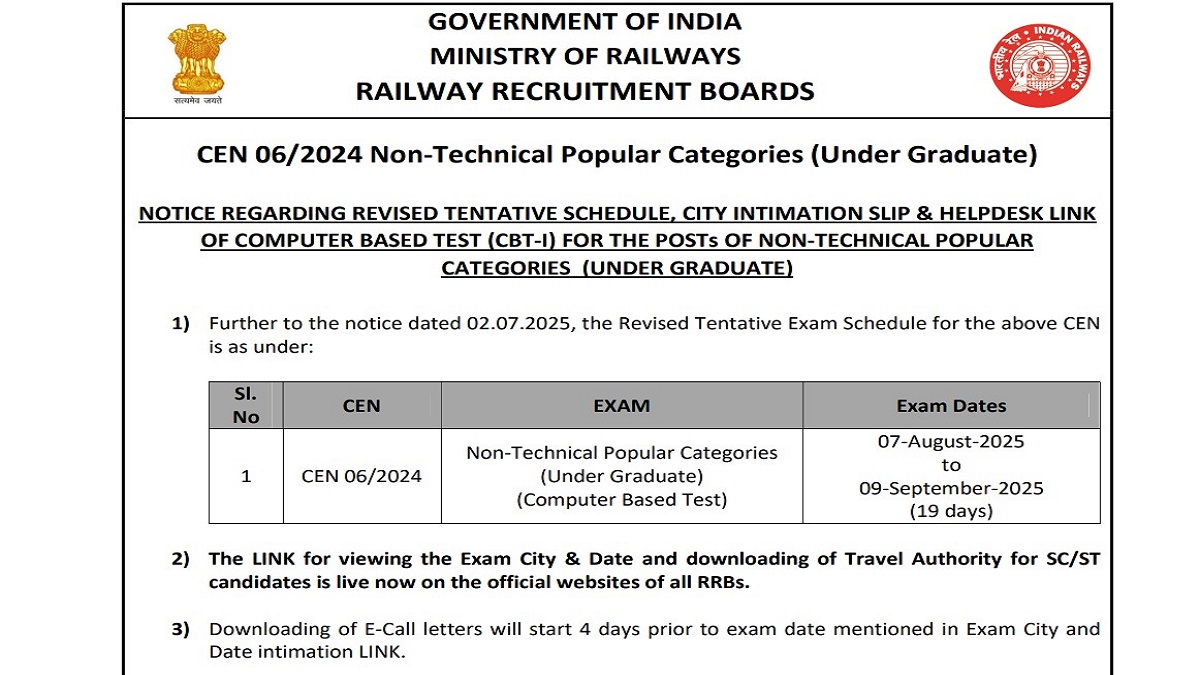 RRB NTPC 2025 CBT 1 exam dates for Undergraduate posts have been revised. Now, the RRB NTPC UG exam 2025 will be held till September 9. Candidates appearing for the exam must download their RRB NTPC city intimation slip by visiting the official website. Check official notice here