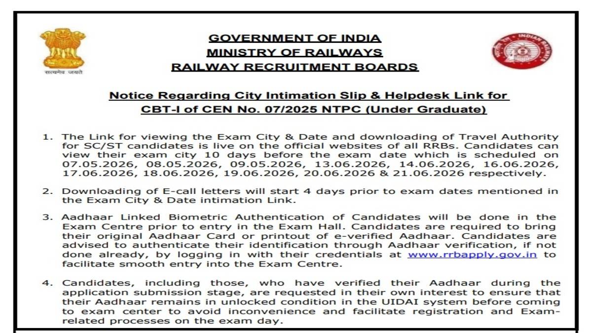 The Railway Recruitment Board released the RRB NTPC 2026 Under Graduate City Intimation Slip for CEN No. 07/2025. Candidates who will appear for the exam which is starting from May 7 in the Computer Based Test mode can check their city details from the official website at rrbcdg.gov.in by using their registration number and date of birth. The city intimation slip provides the details about the exam city allotted for the exam and helps candidates to plan their travel and stay in advance.