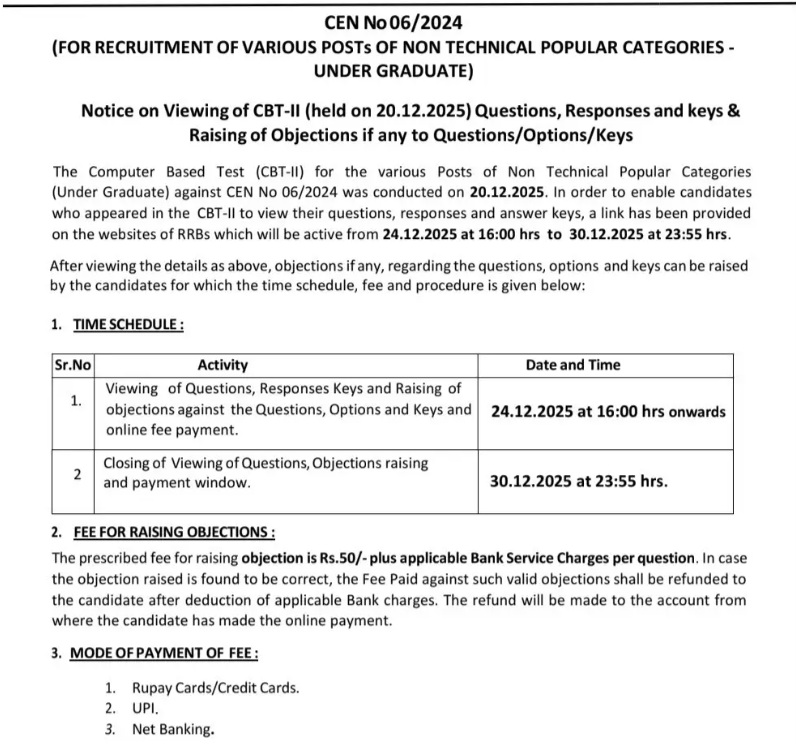 Candidates who find any discrepancy in their RRB NTPC undergraduate answer key can raise objections by paying INR 50 per question till December 30, 2025.