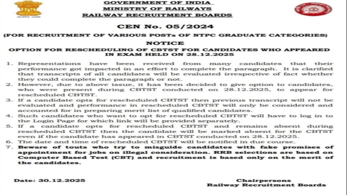 Railway Recruitment Board has rescheduled RRB NTPC exam date 2025 for CBTST. The exam, held on December 28, was cancelled. It happened due to technical problem.