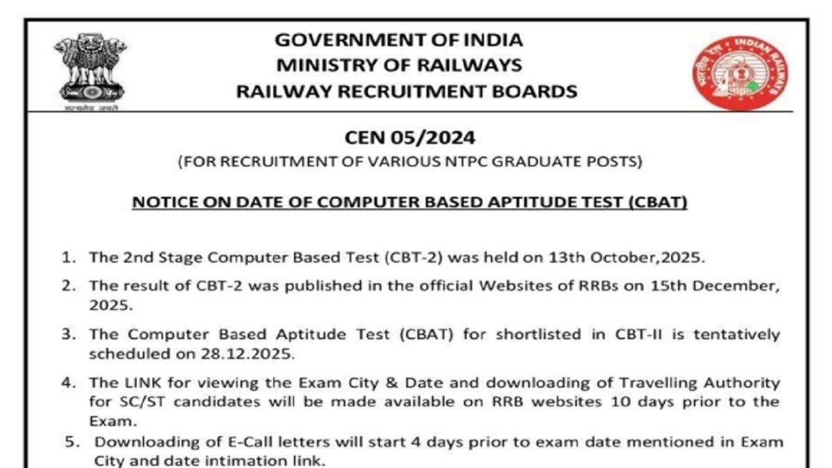 Railway Recruitment Board has announced CEN 05/2024 RRB NTPC CBAT exam date today for graduate posts. As per notice, Computer-Based Aptitude Test will tentatively be held on December 28, 2025. Only those candidates who have been selected in CBT 2 exam of RRB NTPC 2025 held in October 13 are eligible to appear for CBAT. They must note that Aadhaar-linked biometric authentication will be carried out at exam center before entry. Therefore, they must bring their original Aadhaar card.