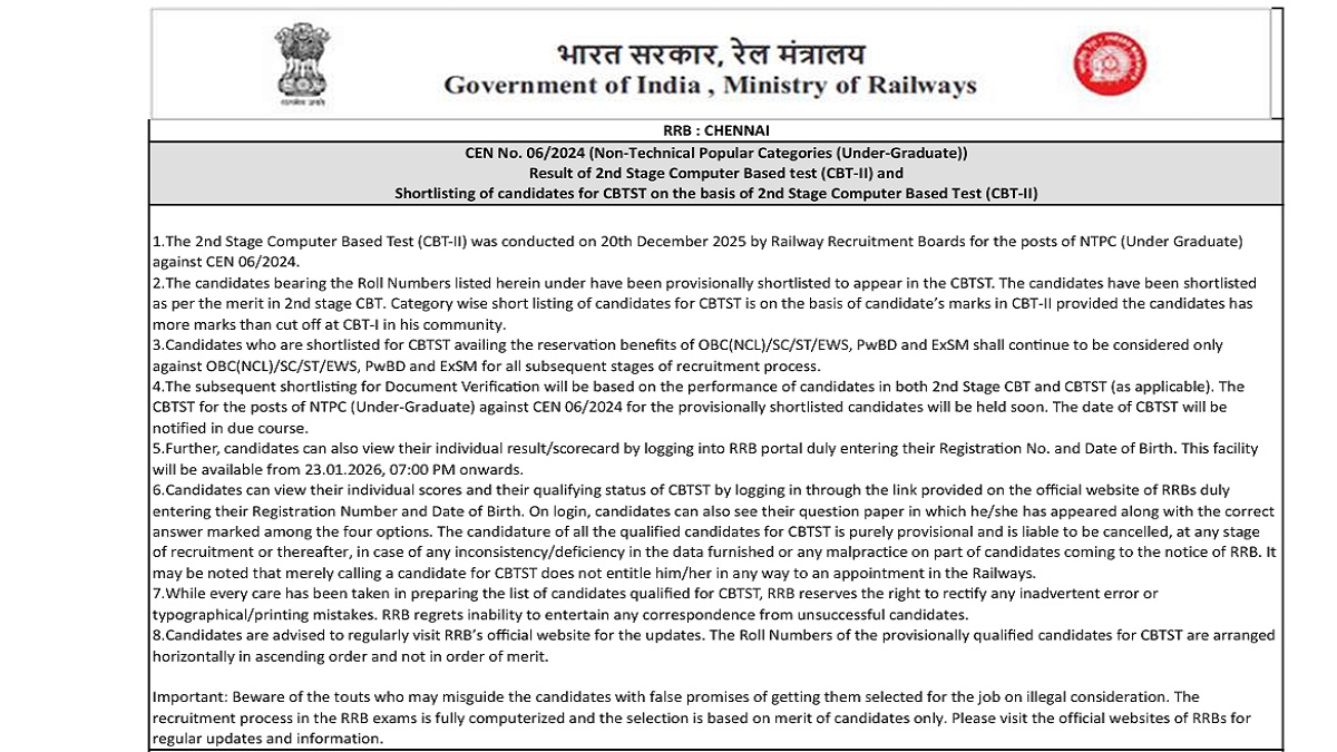 RRB NTPC UG Result: Railway Recruitment Board has released result for RRB NTPC CBT 2 today, January 23. Candidates can get RRB NTPC undergraduate result link for CBT 2 at railways regional websites. They must note that RRB NTPC UG CBT 2 CEN 06/2024 is available in PDF format, therefore, no login credentials are needed. Also, scorecard for RRB NTPC has also been released.