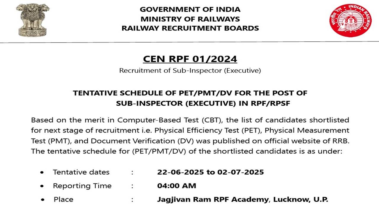 As per the tentative schedule, PET/ PMT/ DV will be conducted from June 22 to July 2, 2025. The reporting time will be 4 AM and the venue is Jagjivan Ram RPF Academy, Lucknow, Uttar Pradesh. It must be noted that RRB will release the exact date of individual tests for the candidates soon through its official portal. Official notification will also sent to each shortlisted candidate via SMS and email.