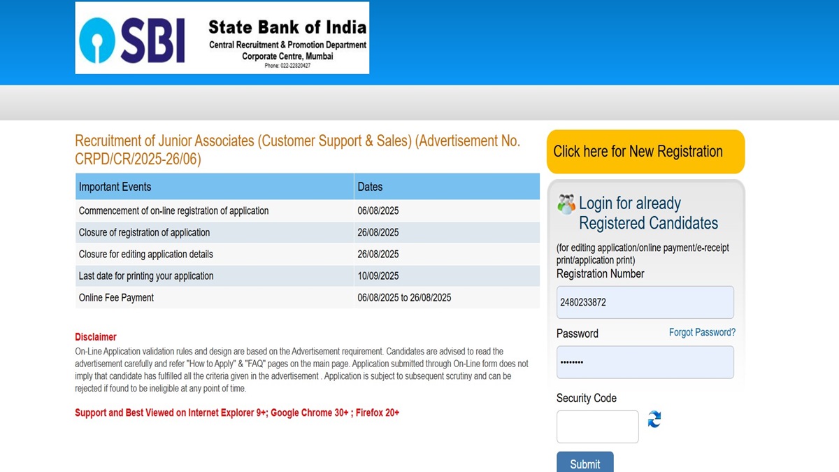 SBI Clerk application form was released on August 6, 2025. The application form was released online only. The last date to fill the SBI Clerk application form was August 26, 2025.