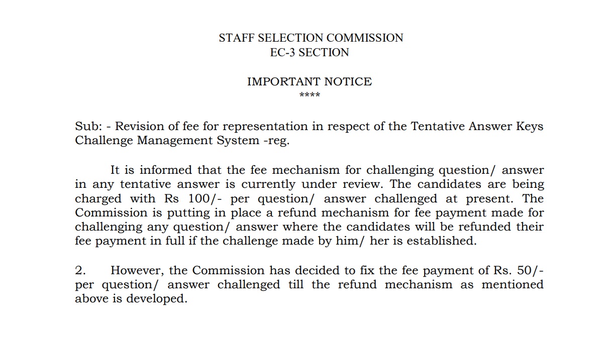 The Staff Selection Commission has revised the answer key objection fee to INR 50. Till now, candidates needed to pay INR 100 per SSC answer key objection. The Commission is currently reviewing the fee mechanism for submitting challenges against the tentative answer key or question paper. An SSC answer key objection fee refund mechanism is being put in place, wherein the fees submitted by candidates will be refunded if their challenges have been accepted. Till the development of the fee refund mechanism, candidates need to pay INR 50 per objection against the official SSC answer key 2025.