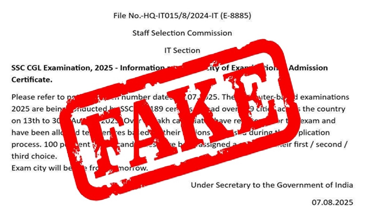 SSC CGL 2025 Fake Notice Circulated: The Staff Selection Commission is expected to conduct the SSC CGL 2025 Tier 1 exam from August 13 to 30 at the designated exam centres. The Commission is yet to notify the SSC CGL Tier 1 Exam Schedule on its official website – ssc.gov.in. There is an unofficial notice doing rounds in the Social Media that the Staff Selection Commission will release the SSC CGL exam city information on its official website – ssc.gov.in today.