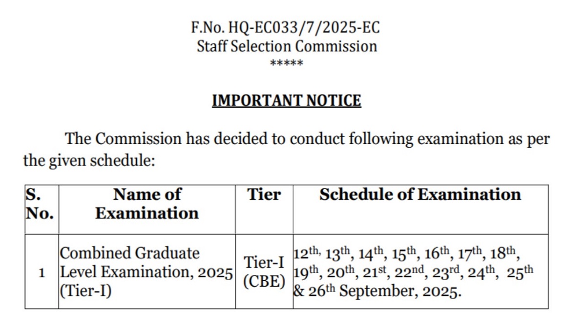 SSC CGL Exam Dates 2025: The Staff Selection Commission has released the exam dates for SSC CGL 2025 recruitment. As per the new schedule, the SSC CGL tier 1 exam will be conducted from September 12 to 26, 2025. The official SSC CGL Tier 1 exam dates 2025 notice pdf has been released on the official website: ssc.gov.in. Earlier, the SSC CGL 2025 exam was scheduled to be held from August 13 to 30, but it was postponed due to technical issues.