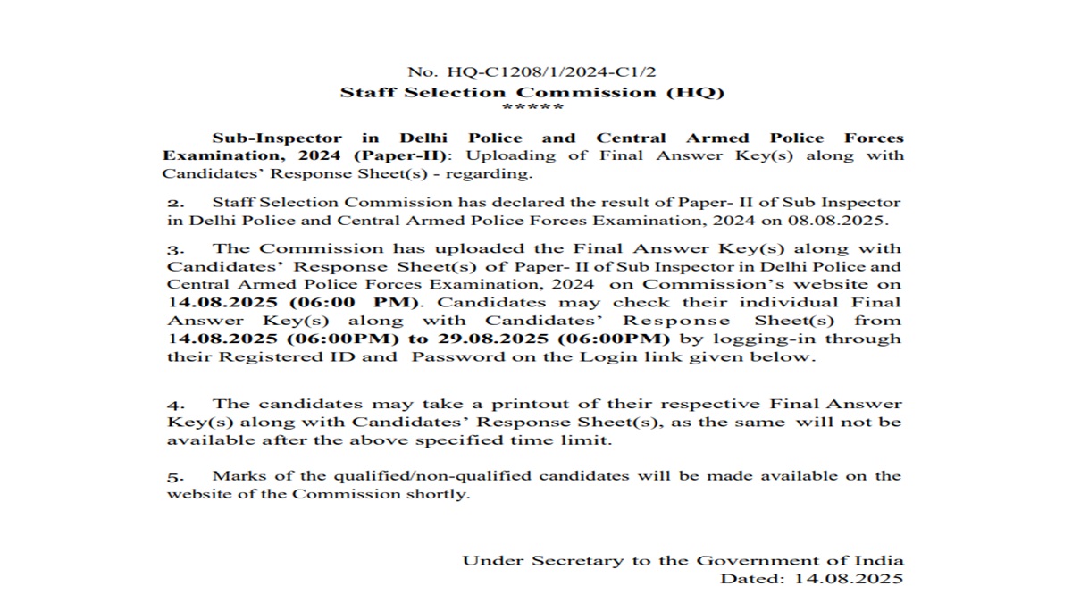 Staff Selection Commission (SSC) released SSC CPO final answer key. The last date to download the answer key is August 29, 2025. The Commission has also released SSC Stenographer 2024 marks. The answer key and marks can be downloaded by logging with the required credentials. The last date to check the marks of SSC Stenographer is September 13, 2025.