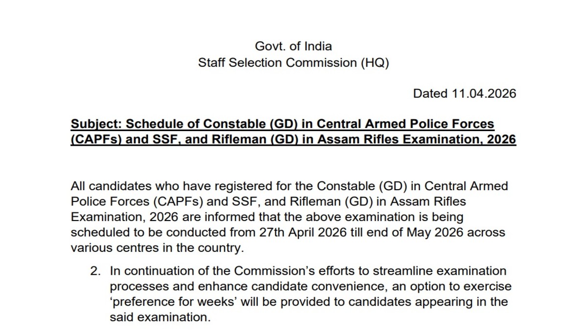 The Staff Selection Commission (SSC) has finally announced the SSC GD 2026 exam schedule or new exam date on April 11 at ssc.gov.in. As per the official notice, the SSC Constable (GD) in Central Armed Police Forces (CAPFs) and SSF, and Rifleman (GD) in Assam Rifles Examination, 2026 will be conducted from April 27 and will end on May 30 at various centres across the country. The exam will be conducted in four phases.