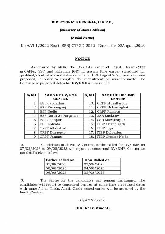 Candidates from 18 centre, namely BSF Jalandhar, CRPF Muzaffarpur, BSF Kishanganj, CRPF Mokamaghat, BSF Nadia, CRPF Rampur, BSF North, Parganas, SSB Lucknow, BSF Jodhpur, SSB Muzaffarpur, BSF Kolkata, ITBP Chandigarh, CRPF Allahabad, ITBP Tigri, CRPF Durgapur, ITBP Dehradun, CRPF Jammu, ITBP Greater Noida, are now directed to report for DV/DME on preponed dates.