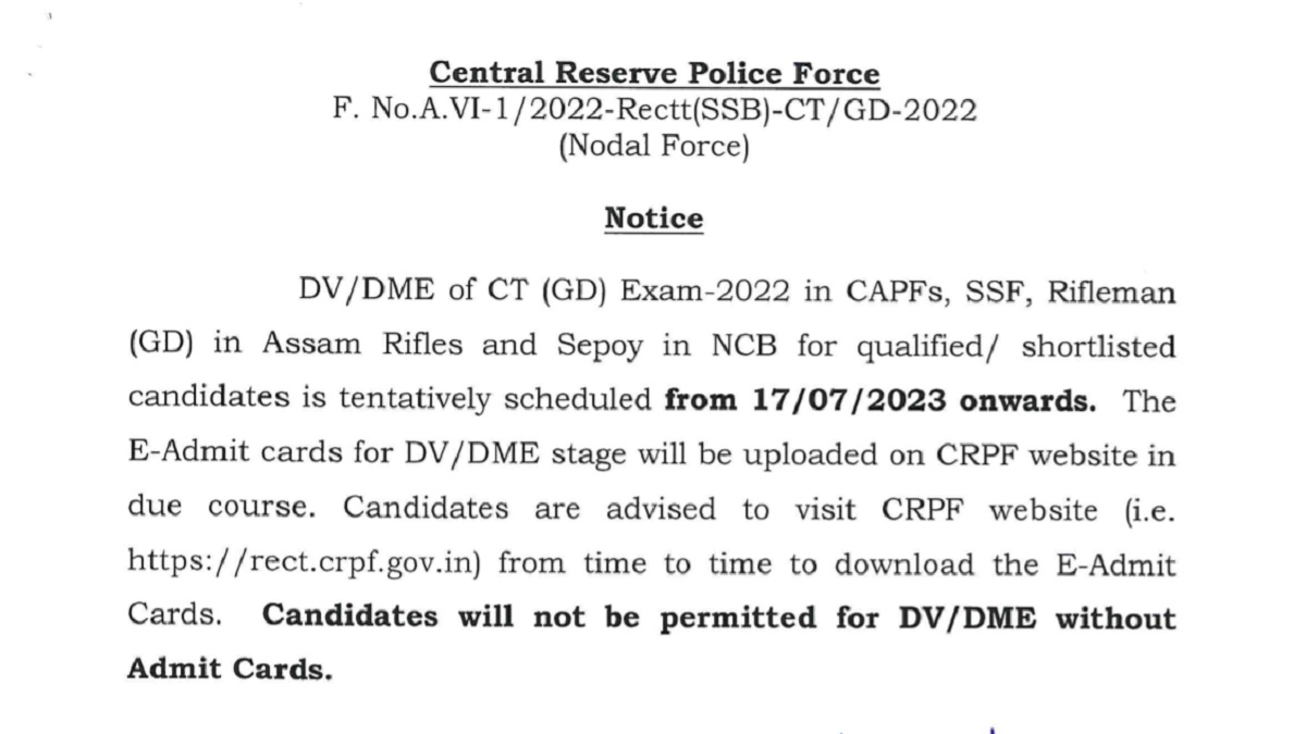 Central Reserve Police Force (CRPF) has announced the schedule of the Document Verification (DV) and Detailed Medical Examination (DME) under the Constable (GD) in CAPFs, SSF and Rifleman (GD) in Assam Rifles and Sepoy in Narcotics Control Bureau Examination, 2022. The SSC GD Constable DV/ DME 2023 exam will be conducted from July 17, 2023 onwards.