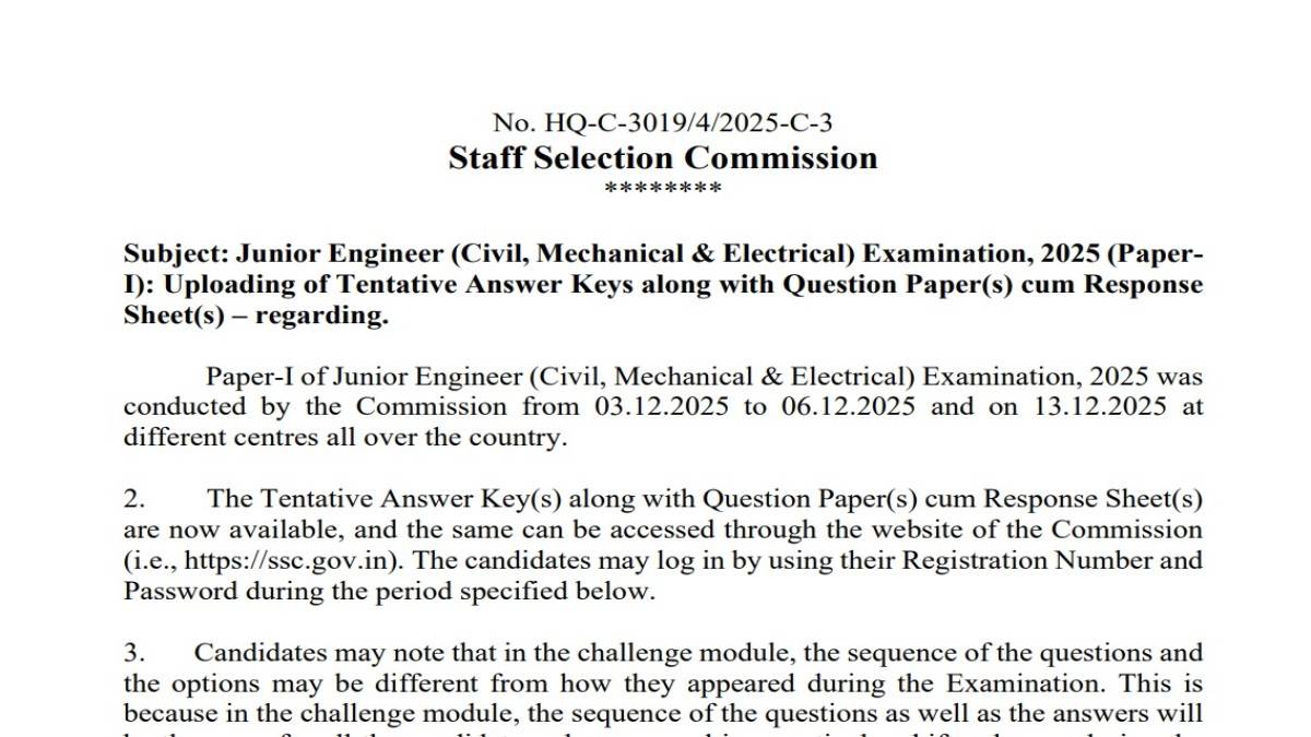 The Staff Selection Commission released the SSC JE answer key for Paper 1 at ssc.gov.in. The answer key was released along with the correct responses to the questions asked in the examination. Candidates will also provided an opportunity to raise an objections to the answer key for discrepancy till December 22 (6 pm). The objection fee is INR 50 per question/answer challenged. The SSC JE 2025 Tier 1 exam was conducted from December 3 to 6, 2025 and on December 13, 2025 across the different centres all over the country. To check the tentative answer key candidates need to log in by using their Registration Number and Password. Scroll down for more details.