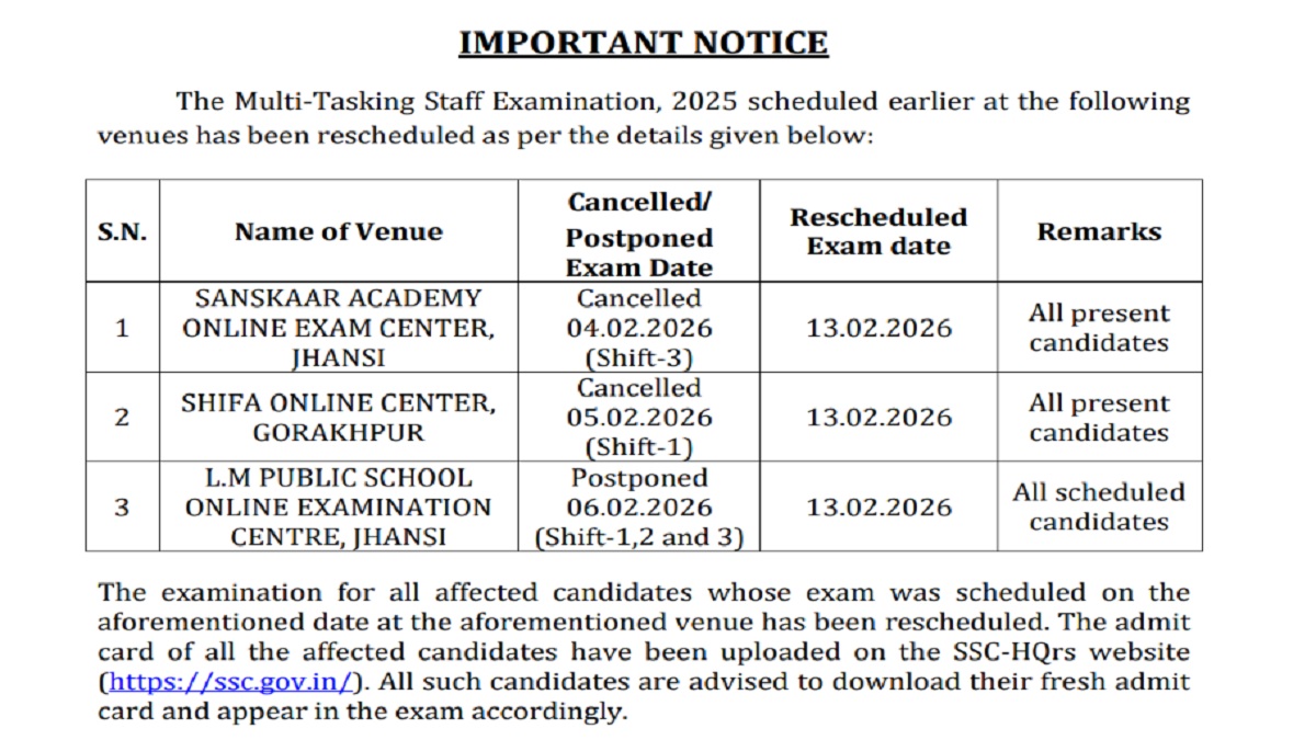 SSC MTS 2025 Exam Dates: The Staff Selection Commission has released a notice regarding rescheduling of SSC MTS exam 2025 at some of the exam centres due to administrative reasons. According to official notice released, SSC MTS exam at certain centres in Jhansi and Gorakhpur was either cancelled or postponed. The revised schedule for the affected venues has also been released. Candidates who were scheduled to appear at the affected venues on earlier dates will now have to appear for SSC MTS exam on February 13, 2026.