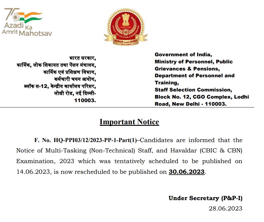 SSC MTS Notification 2023: Staff Selection Commission is all set to release SSC MTS & Havaldar Notification 2023 on June 30. In the latest notification released by the commission, SSC said, "Candidates are informed that the Notice of Multi-Tasking (Non-Technical) Staff, and Havaldar (CBIC & CBN) Examination, 2023 which was tentatively scheduled to be published on 14.06.2023, is now rescheduled to be published on 30.06.2023."