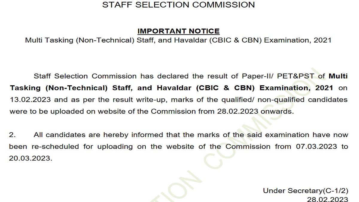 SSC MTS Paper 2 Marks and Scorecard 2023: The Staff Selection Commission released a notice mentioning that SSC MTS marks and scorecard will be released later. SSC MTS Paper 2 result 2021 was released online on February 13, 2023. The Staff Selection Commission mentioned in the result write-up that the SSC MTS marks and scorecard were to be uploaded on the official website on February 28 but the Commission did not release the SSC MTS marks and scorecard for SSC MTS 2021 exam. The Staff Selection Commission will now upload the SSC MTS paper 2 marks and scorecard on March 7. The SSC MTS paper 2 marks and scorecard will be available to download till March 20.