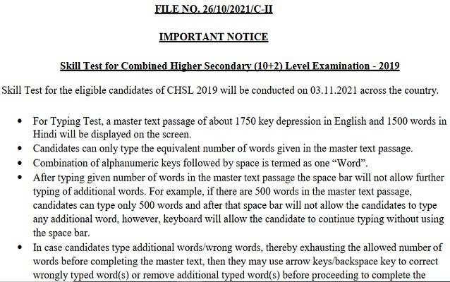 SSC released a notice regarding the Combined Higher Secondary Level CHSL 2019 skill test. Staff Selection Commission (SSC) released the details regarding the skill test scheduled to be conducted from November 3, 2021, onwards. The SSC CHSL skill test is the second last stage of the selection process. The candidates need to qualify the skill test as the marks secured in this phase in not added for the final merit.