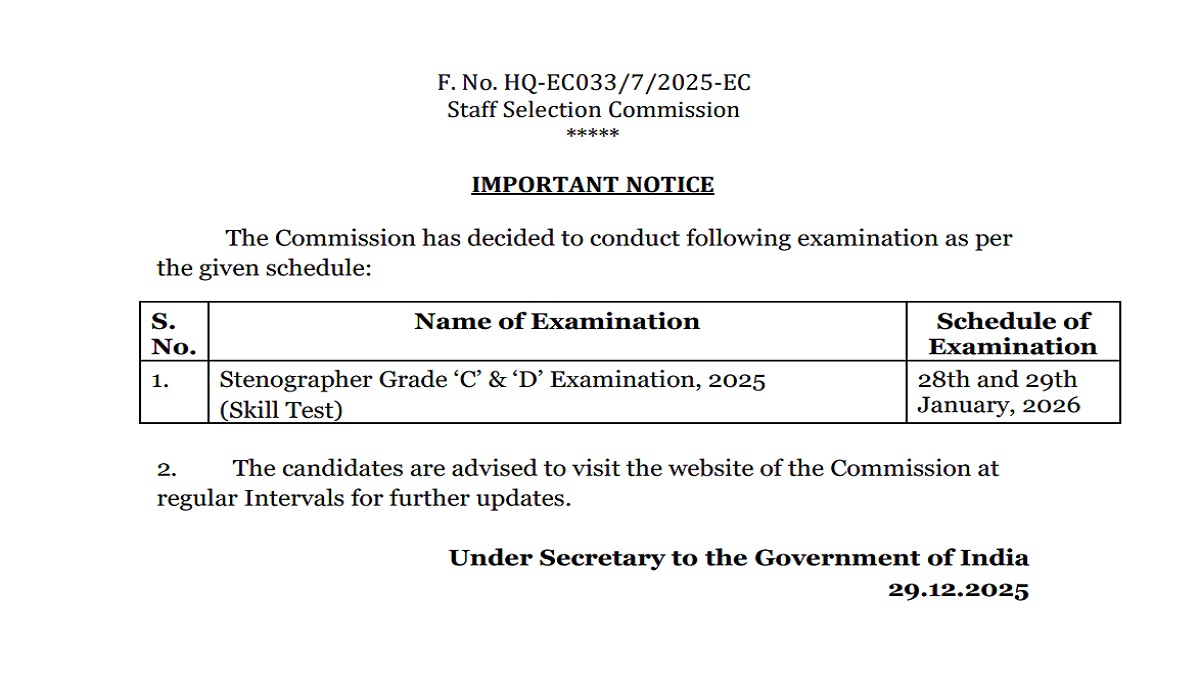 SSC Steno Skill Test Dates 2025: Staff Selection Commission has revised exam date for SSC Stenographer 2025 skill test. As per new notice released on official website, now SSC Steno skill test will be conducted on January 28 and 29, 2026. Earlier, SSC Stenographer skill test was tentatively scheduled to be held in first week of March 2026. Candidates must note that SSC Steno skill test will be held on computers in English and Hindi at speeds of 80, 100, and 120 words per minute (WPM). SSC conducts Stenographer exam for recruitment of Stenographer Grade C (Group B Non-Gazetted) and Grade D (Group C) for various Ministries/ Departments/ Organisations.