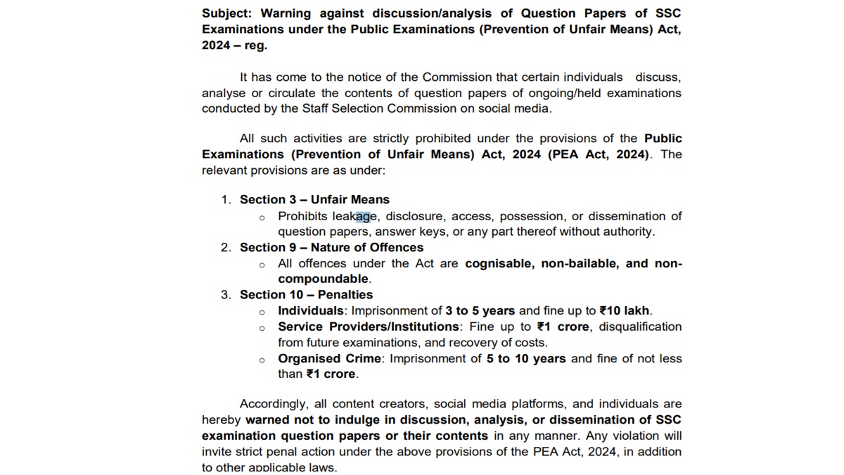 Staff Selection Commission warns content creators, social media platforms and individuals against the SSC Question paper analysis of the Upcoming SSC exams, such as CGL 2025, SSC CHSL 2025, SSC MTS 2025 and others. All these activities are prohibited under the Public Examinations (Prevention of Unfair Means) Act, 2024.