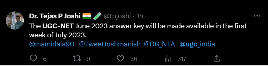 The UGC Joint Secretary Dr. Tejas P Joshi informed the UGC NET aspirants through his Twitter handle that the UGC NET answer key will be released in the first week of July 2023.