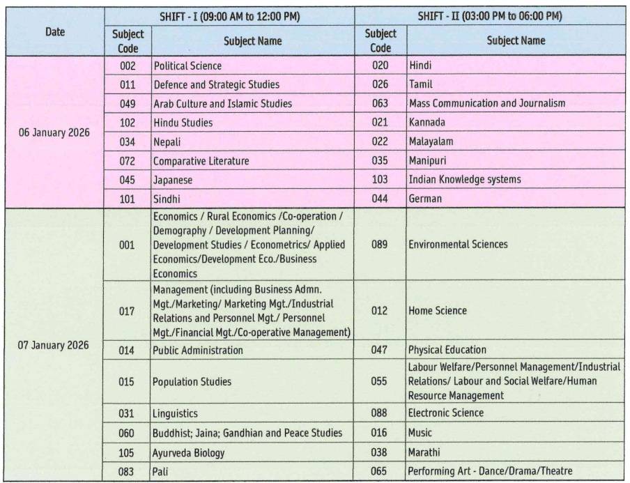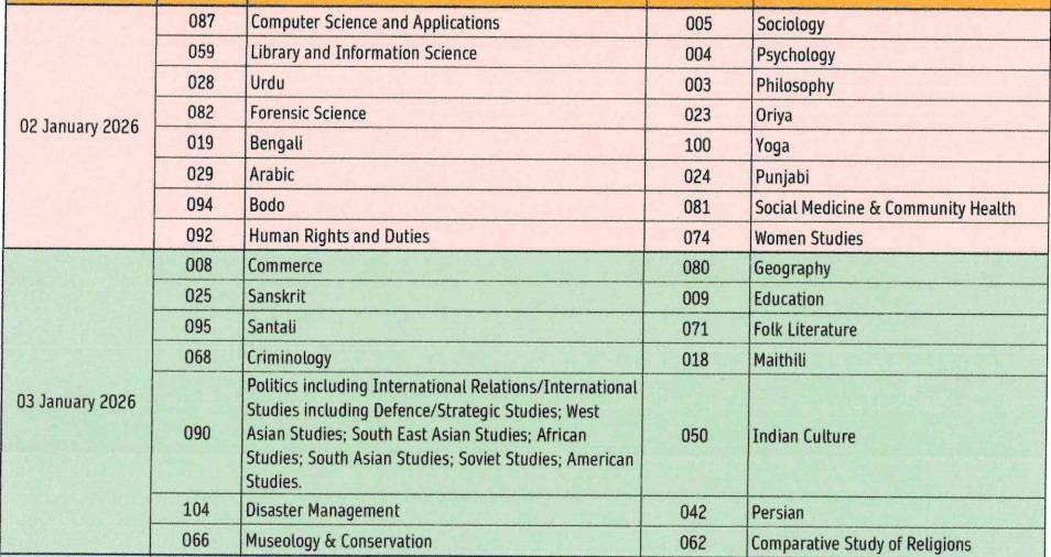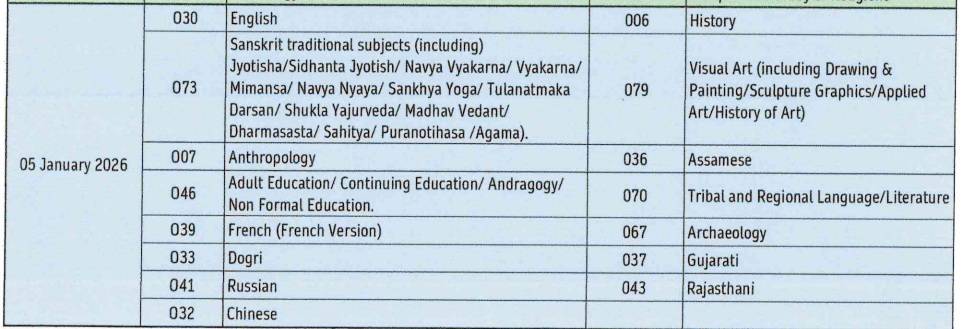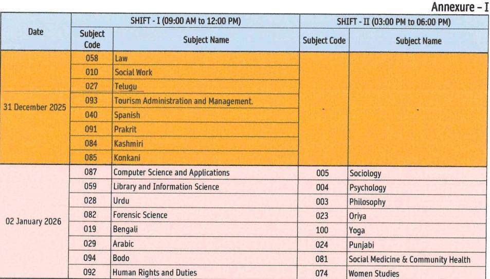 The National Tetsing Agency (NTA) released the whole schedule for the examination which will be conducted from December 31 to January 7, 2026. The schedule has been reelased subject and date-wise. On December 31, the exam will be conducted for law, social work, Telugu, Tourism Administration and Management, Spanish, Prakrit, Kashmiri, Konkani, etc. in the first shift from 9 AM to 12 PM. As per the official notice, the UGC NET city intimation slip will be released 10 days prior to the examination date. Scroll down for detailed schedule.