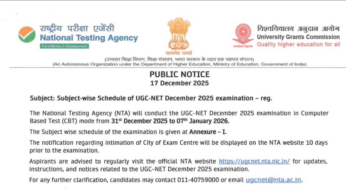The NTA released the UGC NET 2025 Subject-Wise Exam Schedule on December 17 on the official portal. The NTA UGC NET exam will be conducted from December 31 to January 7, 2026. The detail schedule is provided below. Scroll down for details.