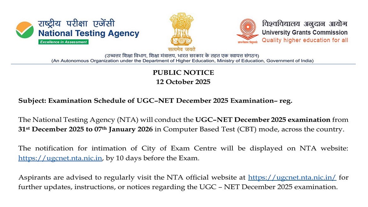 National Testing Agency has announced UGC NET exam dates 2025 for December session. As per notice pdf. UGC NET December 2025 exams will commence on December 31 and continue till January 7, 2026. The UGC NET 2025 exam will be conducted as computer-based test for 85 subjects. While announcing UGC NET December 2025 exam dates, NTA has mentioned that notification for city intimation slip will be released online at ugcnet.nta.nic.in, 10 days before exam starts.