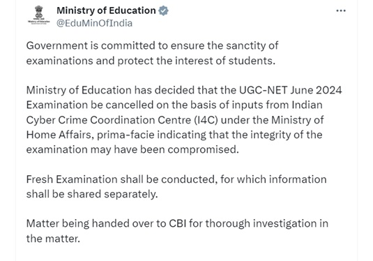 The Ministry of Education, Government of India, has announced the cancellation of the UGC-NET June 2024 Examination following concerns over the integrity of the examination process. This decision comes after inputs from the Indian Cyber Crime Coordination Centre (I4C) under the Ministry of Home Affairs indicated a potential compromise in the examination's integrity.