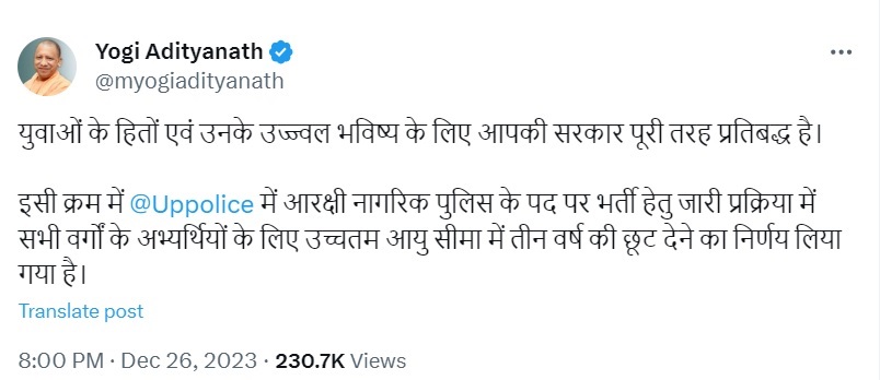 Uttar Pradesh CM Yogi Adityanath announced on social media, that 3 years of age relaxation will be provided to all the categories in the UP Police Bharti 2023. The Uttar Pradesh Police will start the online recruitment process for UP Police Constable on December 27, 2023. Check the official update below.