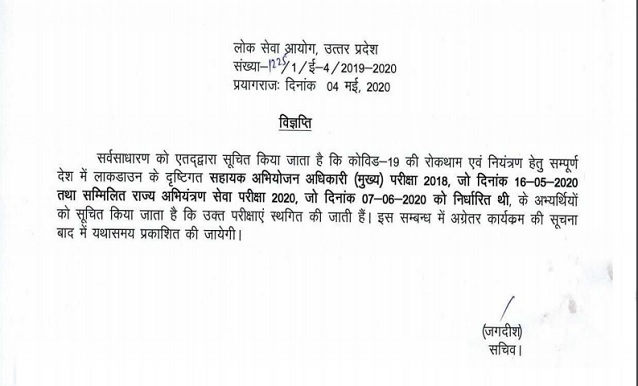 Uttar Pradesh Public Service Commission (UPPSC), Assistant Prosecution Officer Mains Examination-2018 and State Level Engineering Service exam has been postponed amid the ongoing coronavirus crisis in the country.