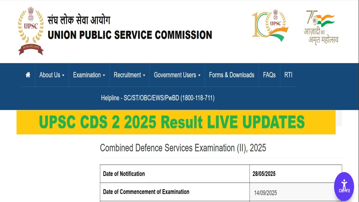 CDS 2 Result 2025 LIVE: The Union Public Service Commission (UPSC) declared the Combined Defence Services Examination 2 result on October 9 at upsc.gov.in. Those candidates who appeared in the exam can check their result by visiting the official website or via the direct link is provided below. The UPSC CDS 2 exam was conducted on September 14, 2025, in three shifts to fill out the 453 vacancies. The Commission will prepare a merit list for the candidates who secure a minimum qualifying mark on the written examination. Candidates who clear the written exam will be called for the intelligence and personality test at the SSB. Candidates can check below for the latest live updates about the CDS2 result.