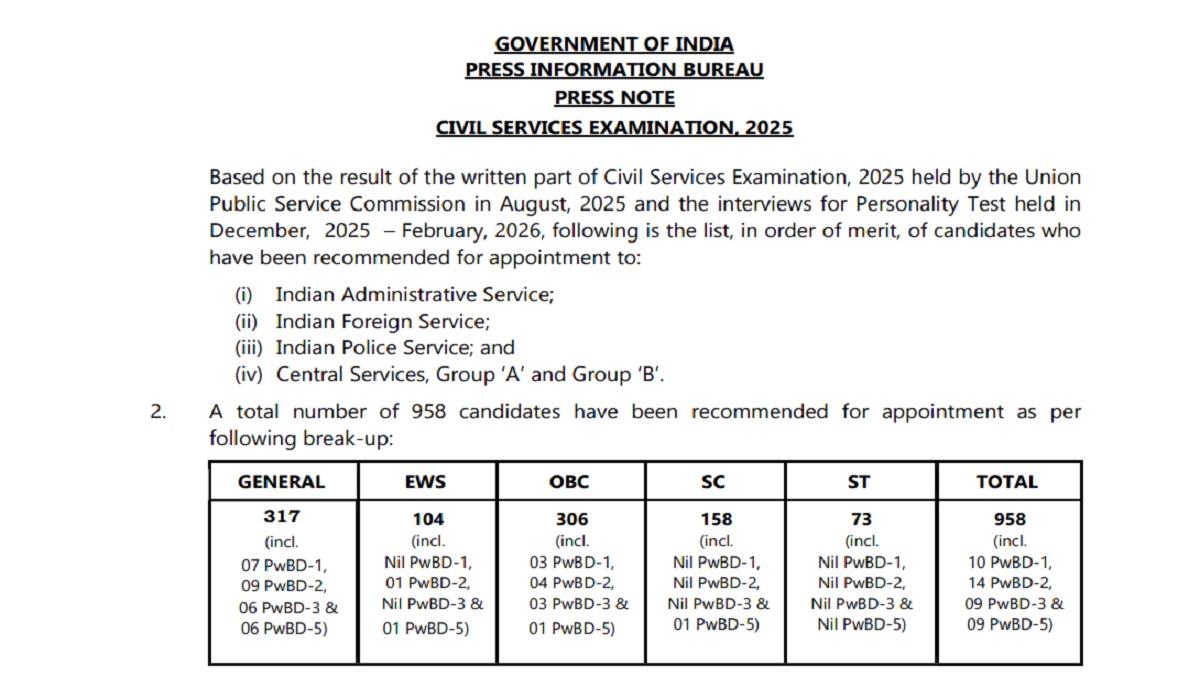 UPSC CSE final result 2025 has been announced today. This time, Commission has recommended a total of 958 candidates for IAS, IFS, IPS and Central Services. Check steps to download UPSC final result 2025 PDF here