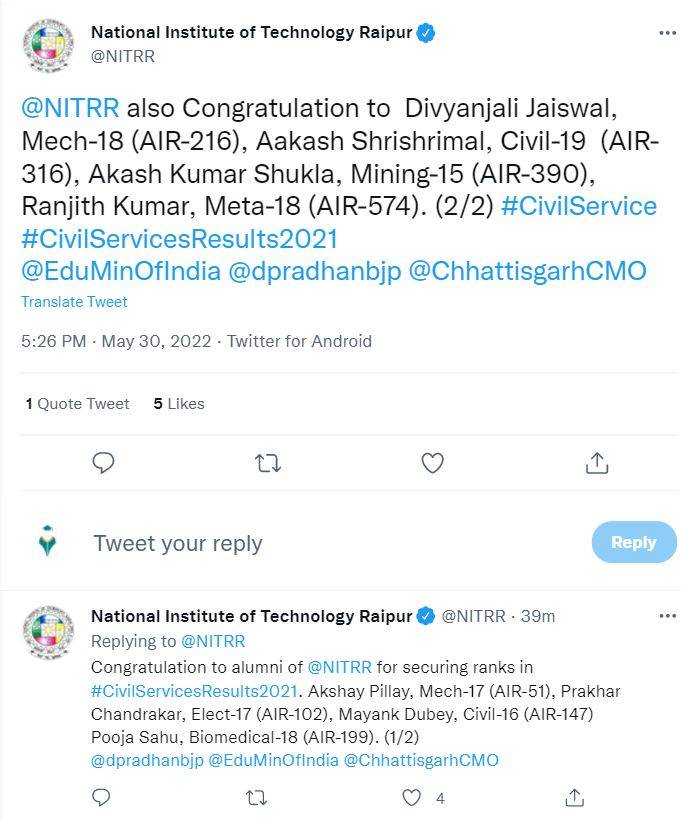 UPSC Results 2021: National Institute of Technology (NIT) Raipur in its latest tweets shares congratulatory wishes for its alumni for securing ranks in the UPSC exam 2021. Wishing the alumni, the institute also shared names and their ranks secured in the Union Public Service Commission Exam 2021. The tweet reads, “Congratulation to alumni of @NITRR for securing ranks in #CivilServicesResults2021. Akshay Pillay, Mech-17 (AIR-51), Prakhar Chandrakar, Elect-17 (AIR-102), Mayank Dubey, Civil-16 (AIR-147) Pooja Sahu, Biomedical-18 (AIR-199).”