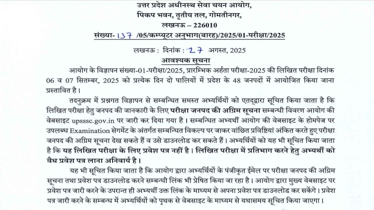 UPSSSC PET 2025 Exam Centre: The Uttar Pradesh Subordinate Service Selection Commission (UPSSSC) released the UP PET 2025 City Intimation Slip on August 27 on the official website at upsssc.gov.in. As per the official notification released, the UPSSSC PET 2025 exam will be conducted in 48 districts in the Uttar Pradesh state on September 6 and 7. Candidates who have registered for the examination will be able to check their exam city details by using their login credentials, including the registration number and date of birth. Scroll down to know the district and city details of the UPSSSC PET exam.
