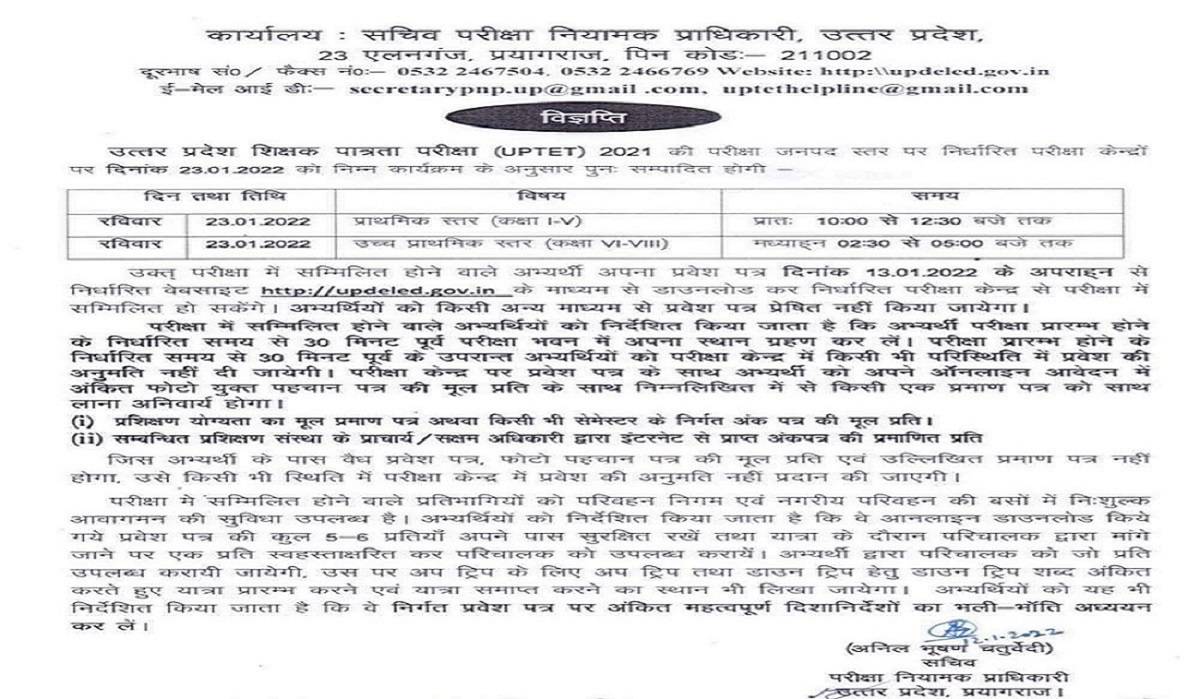 The UPTET exam will be held on January 23, 2022, in various exam centres across the state. Candidates will be required to carry the admit card to the examination centres.