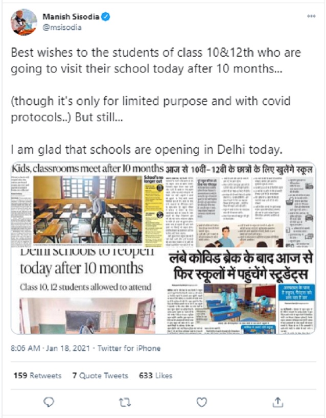 Delhi's Deputy Chief Minister and Education Minister Manish Sisodia also extended his wishes to the students. "Best wishes to the students of class 10&12th who are going to visit their school today after 10 months... (though it's only for a limited purpose and with covid protocols..) But still... I am glad that schools are opening in Delhi today," Sisodia tweeted.