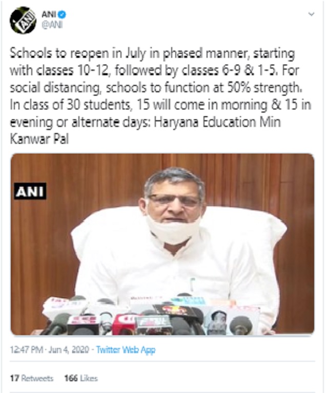 Haryana Education Minister Kanwar Pal Gujjar tweeted that “Schools to reopen in July in phased manner, starting with classes 10-12, followed by classes 6-9 & 1-5. For social distancing, schools function at 50% strength. In a class of 30 students, 15 will come in the morning & 15 in the evening or alternate days".