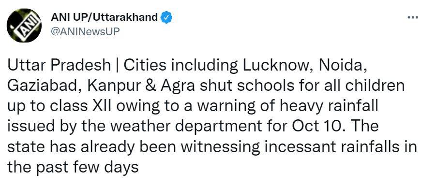 "Due to excessive rain in the district and keeping in view the possibility of excessive rain, the District Magistrate of Gautam Budh Nagar has declared a holiday on October 10 [Monday] in government, semi-government aided, and unaided recognized schools of all the boards operating from class 1 to 12 of the district," a school official in Noida was quoted as saying by PTI.