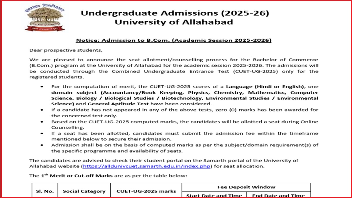 University of Allahabad has released the CUET cutoff 2025 first list for B.Com at allduniv.ac.in. Candidates can now check the minimum CUET marks 2025 required fr admissions to Allahabad University. Shortlisted candidates can check the CUET AU 2025 seat allotment at alldunivcuet.samarth.edu.in and report at the alloted college on or before the last date to reserve seat. Based on the counselling registration and CUET UG 2025 marks, the candidates are alloted seat online.