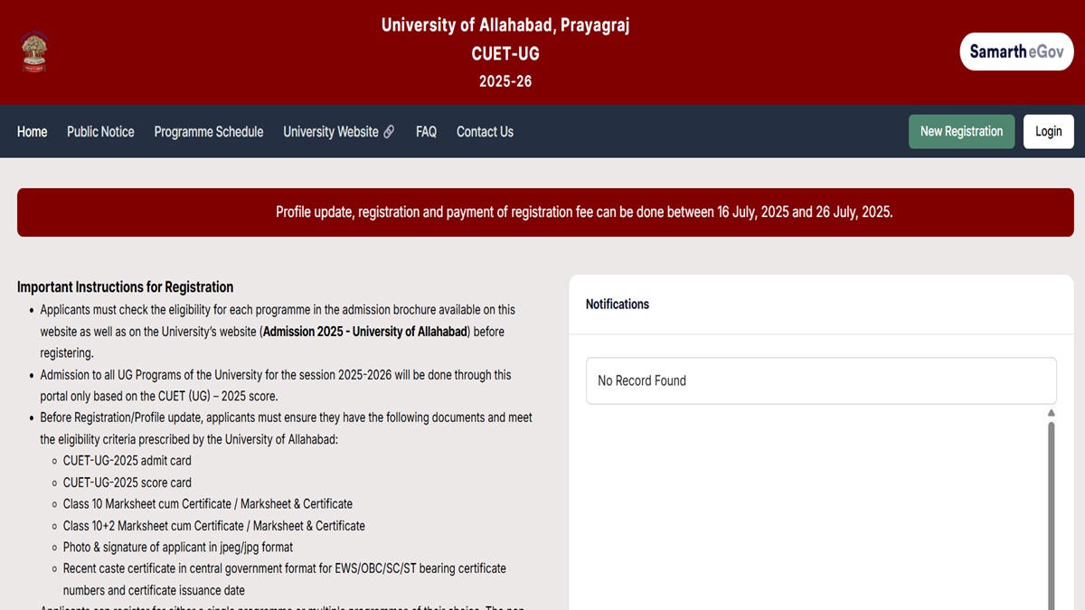 The University of Allahabad has officially commenced the registration for CUET UG 2025 counselling today, July 16, 2025. Eligible candidates can now apply online through the university's official Samarth portal- allduniv.samarth.edu.in. The last date to register, update profiles, and pay the registration fee for Allahabad University admission 2025 is July 26, 2025.