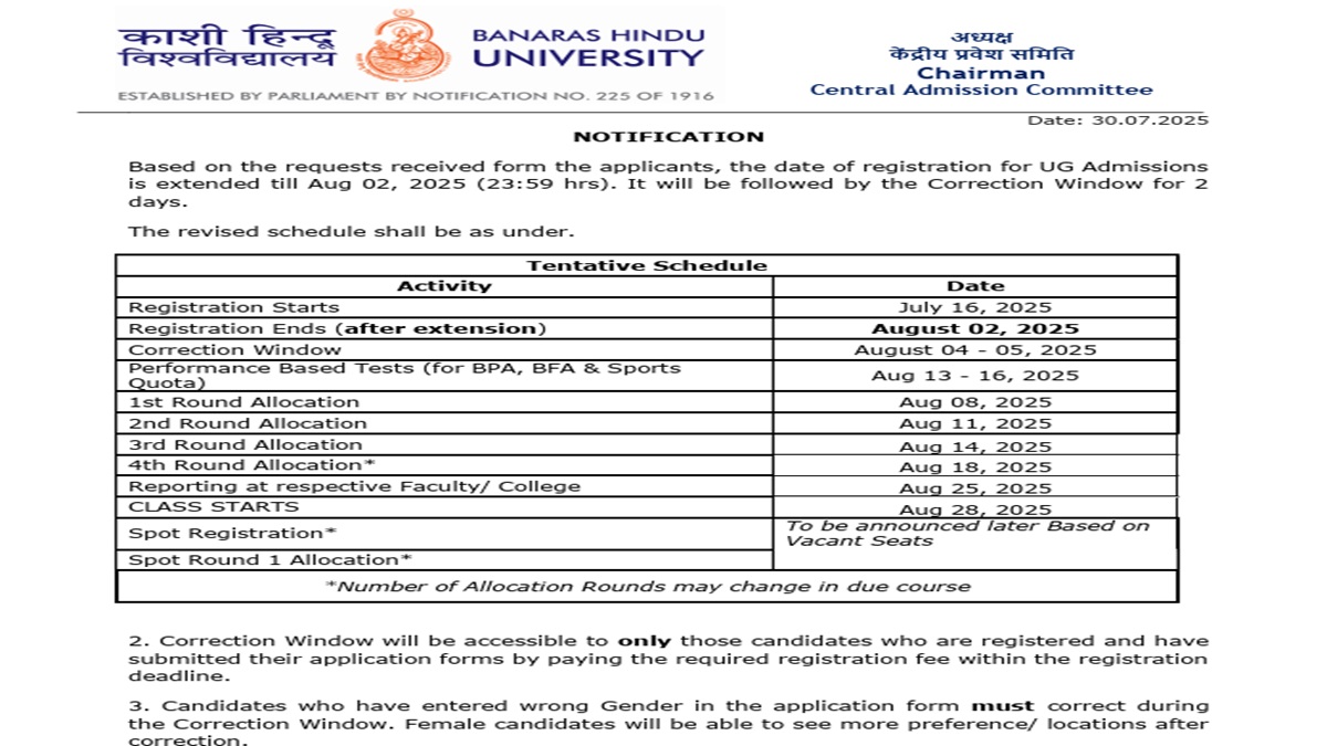 Banaras Hindu University has extended the CAP UG 2025 registration deadline. Candidates can now check the CAP UG 2025 schedule and know the last date of registration, cutoff date, and reporting last date here. Check for complete details here.
