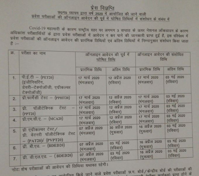 The Chhattisgarh Professional Examination Board (CPEB) has once again changed the application dates of Chhattisgarh Pre-Agriculture Test (CGPAT) 2020. Earlier, the application forms of CG PAT 2020 were to be releaased on April 7, but now it will be released after the lockdown is lifted. Moreover, the exam authority has changed the application schedule of other competitive exams such as CG PET, CG PPT, CG PVPT, and CG BEd Entrance Test since the application process could not be completed due to COVID-19 pandemic and lockdown in India. Candidates can check here the new schedule for CG PAT 2020 applications: