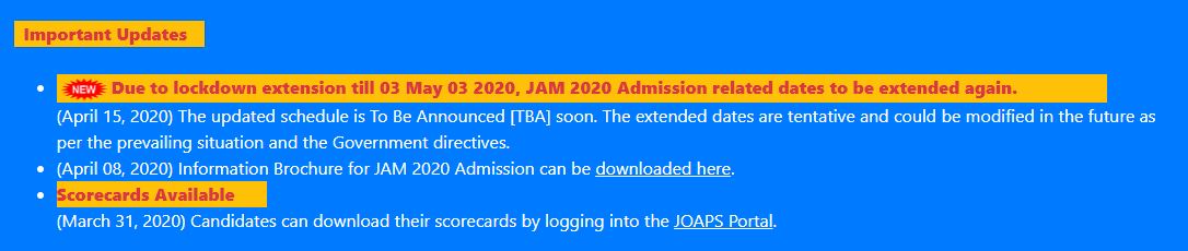 IIT Kanpur will announce the exam dates of JAM 2020 admission process on or after May 4, 2020.