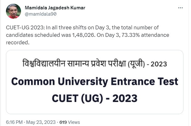 CUET 2023 Day 3 was concluded on May 23 successfully across India and abroad. UGC Chairman M Jagadesh Kumar has shared that at the end of Shift 3, 73.33 per cent attendance has been recorded. A total of 1,48,026 candidates were scheduled to appear on Day 3.